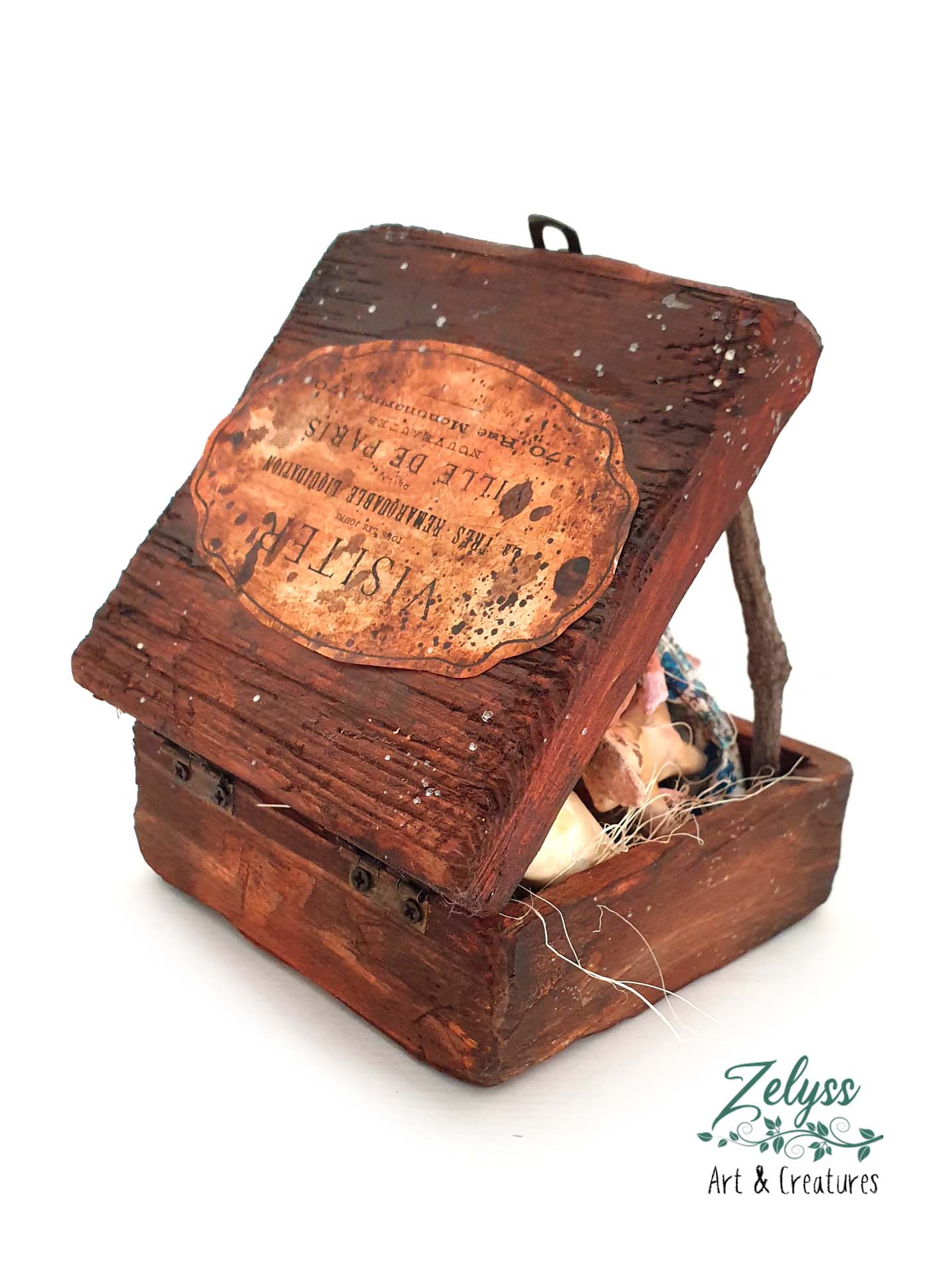 💚 Meet my handmade art sculptures made from paper and recyclable materials ♻️🍃🌏: Here is a little sleepy mouse, who loves cuddles even more than I! In his tiny wooden box, he snoozes with his teddy, at the clock every night, in a tight, sweet hug.
