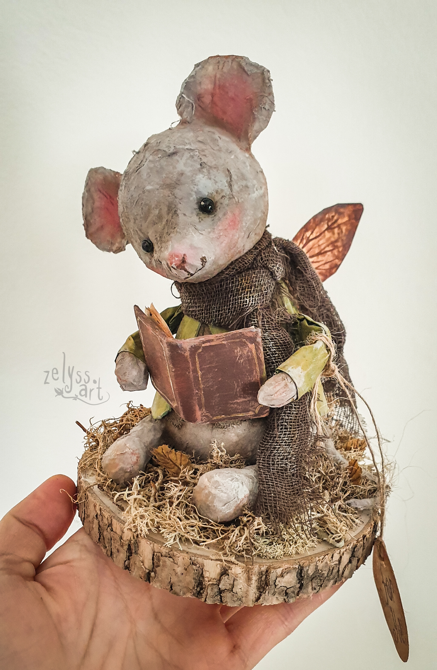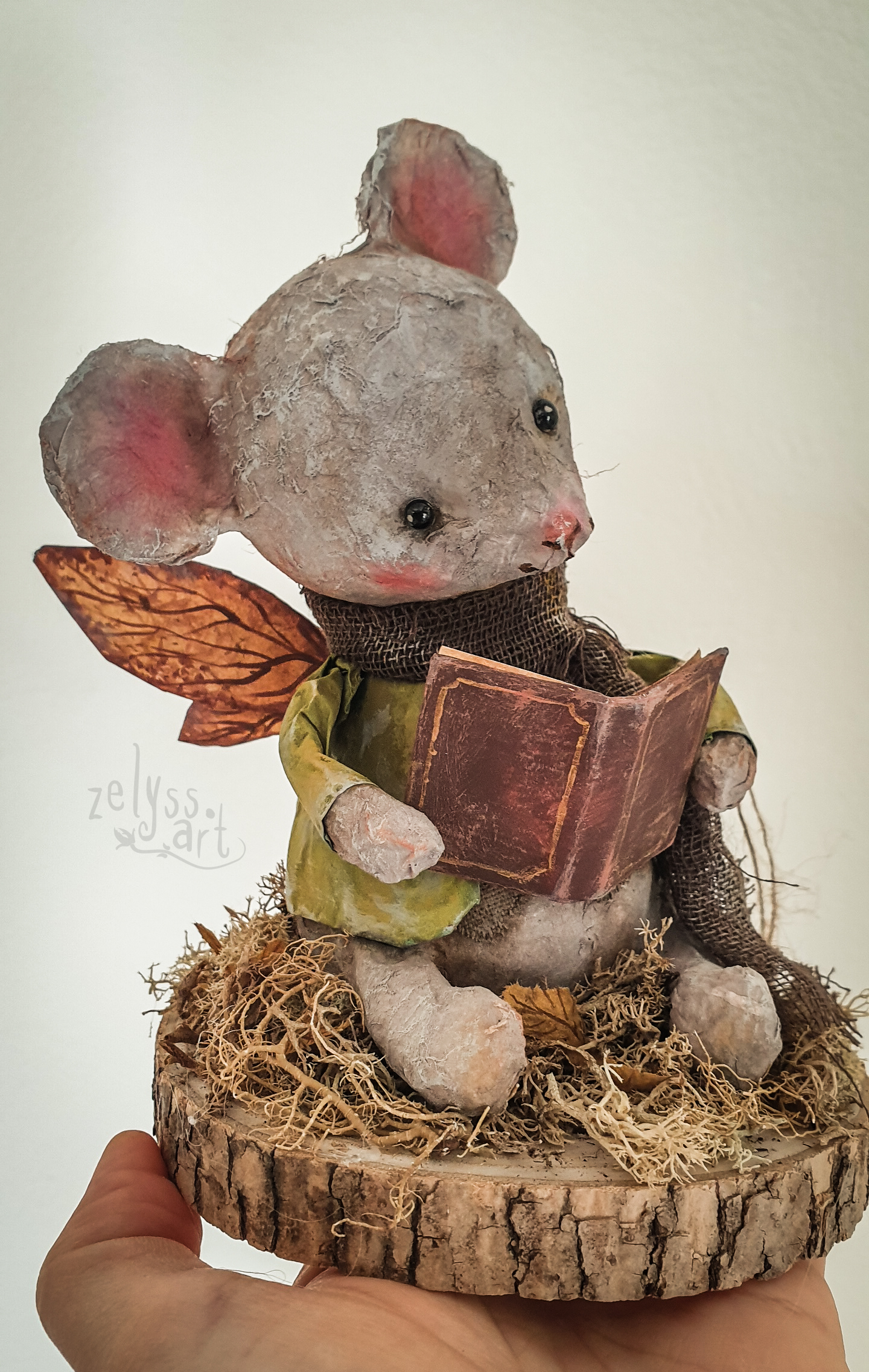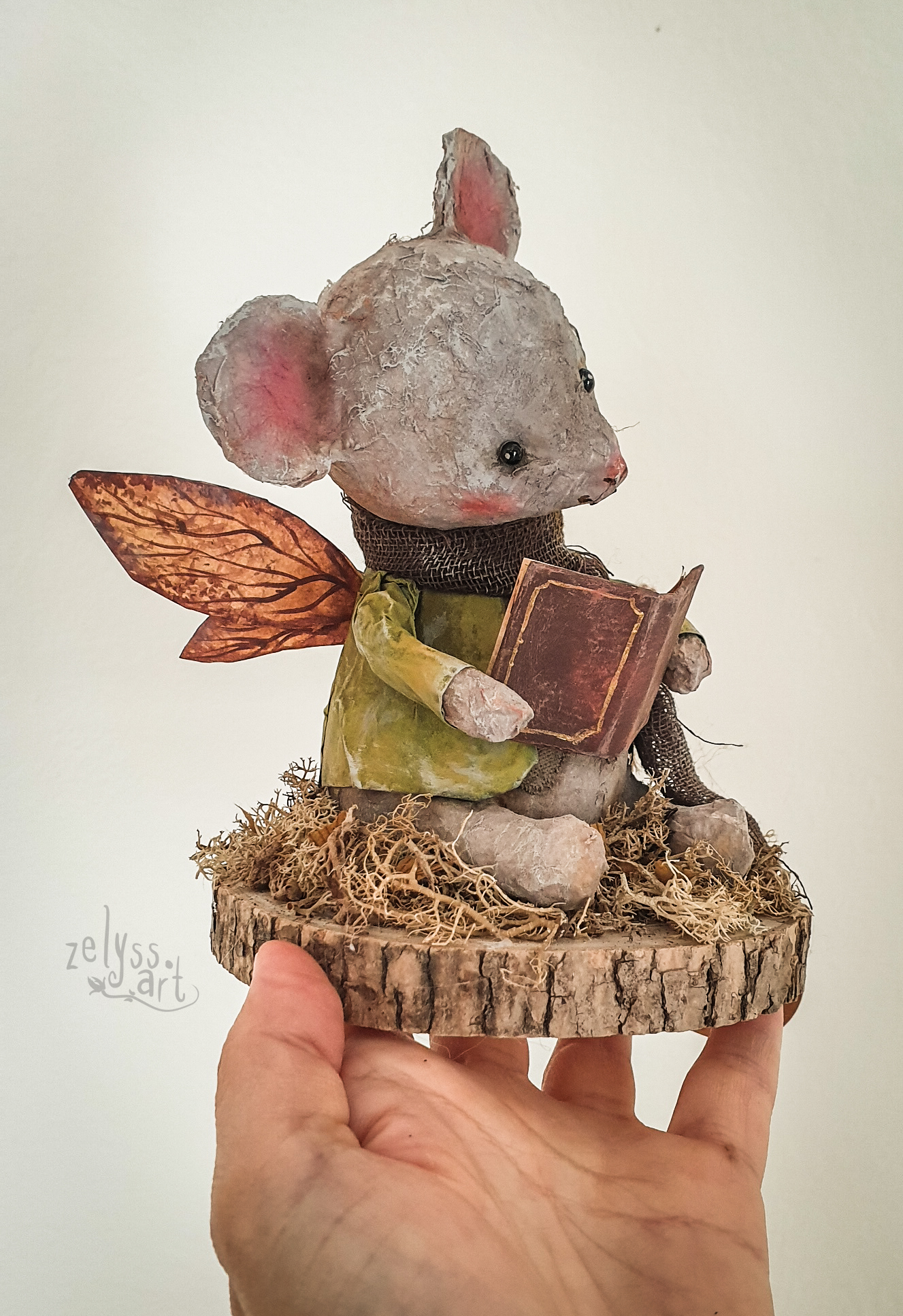💚 Meet my handmade art sculptures made from paper and recyclable materials ♻️🍃🌏: Here is my little fairy-mouse, commonly known as Whistlewhisker! Oh, he’s no ordinary mouse – he has wings! And is too studious for his own good! He has found a very old spellbook tucked beneath a root in the library stump.
