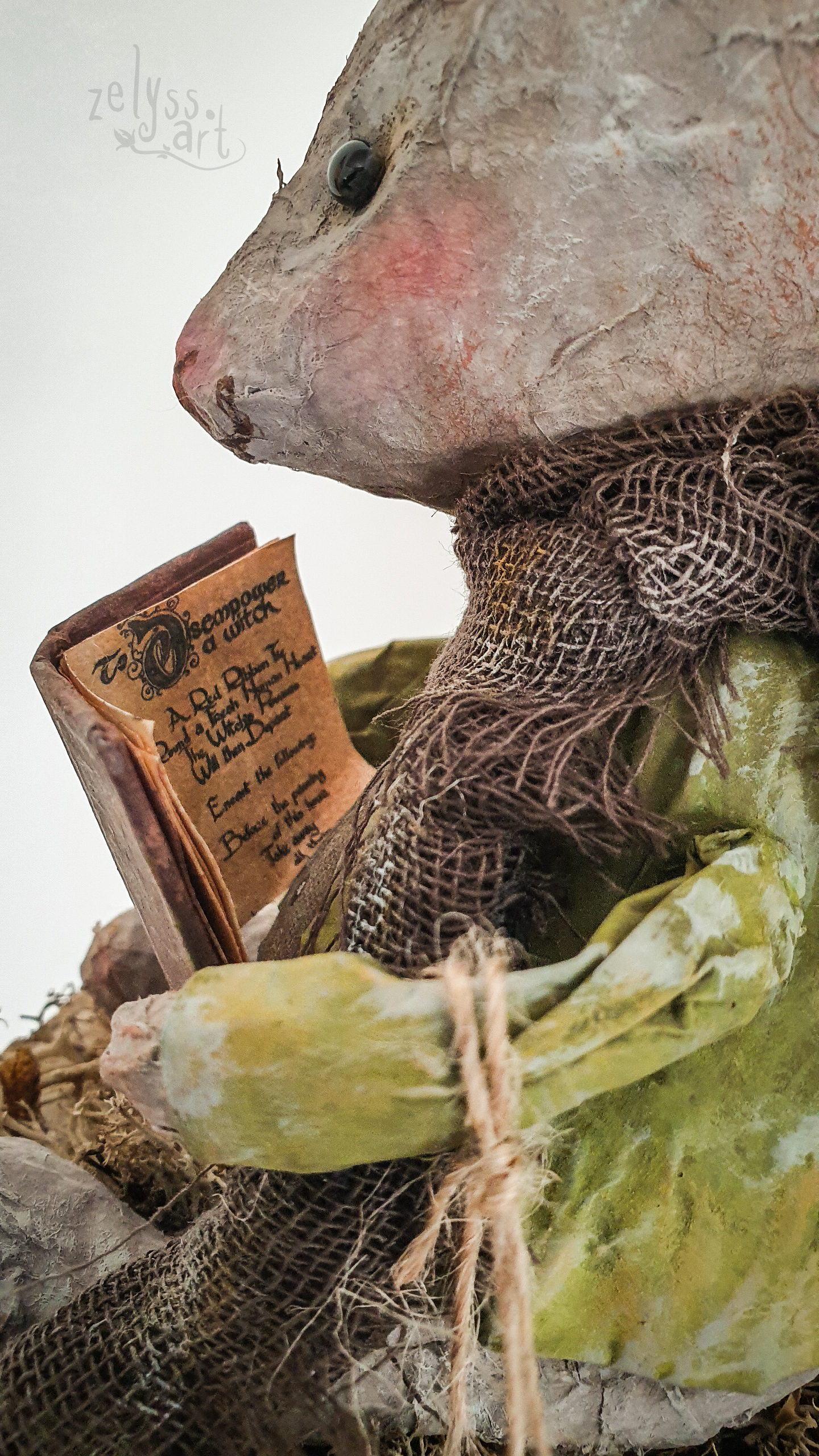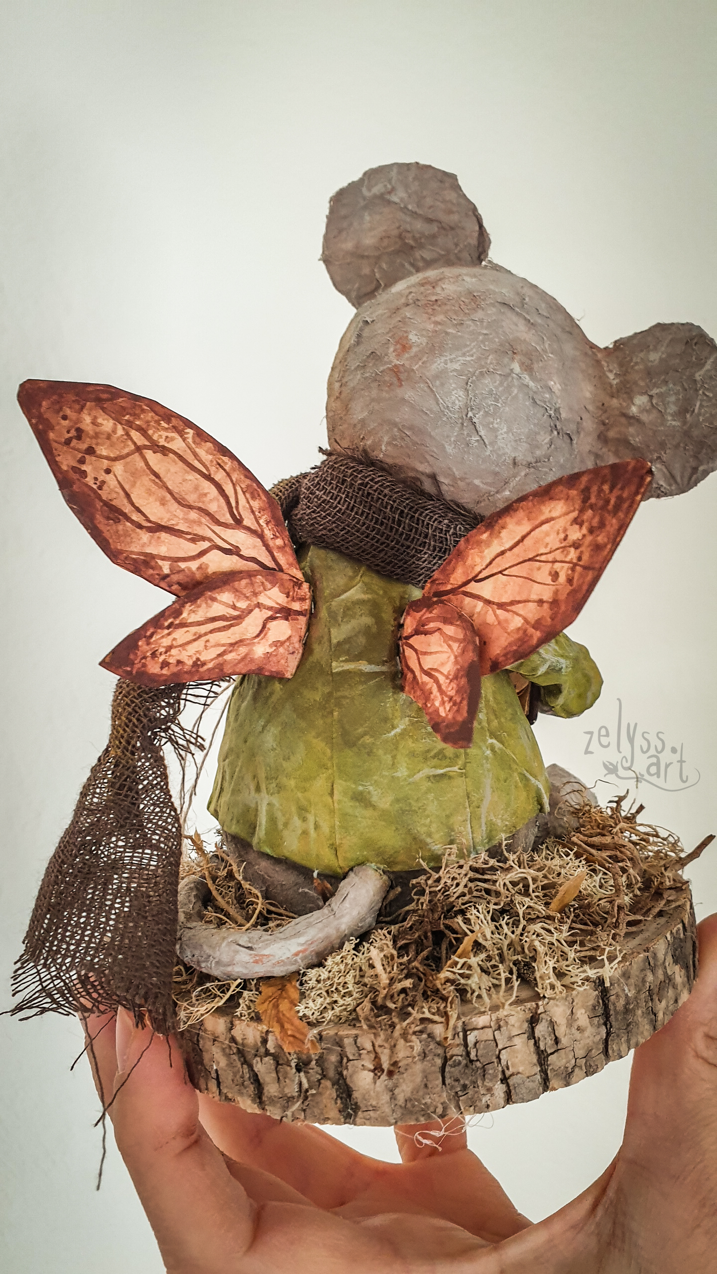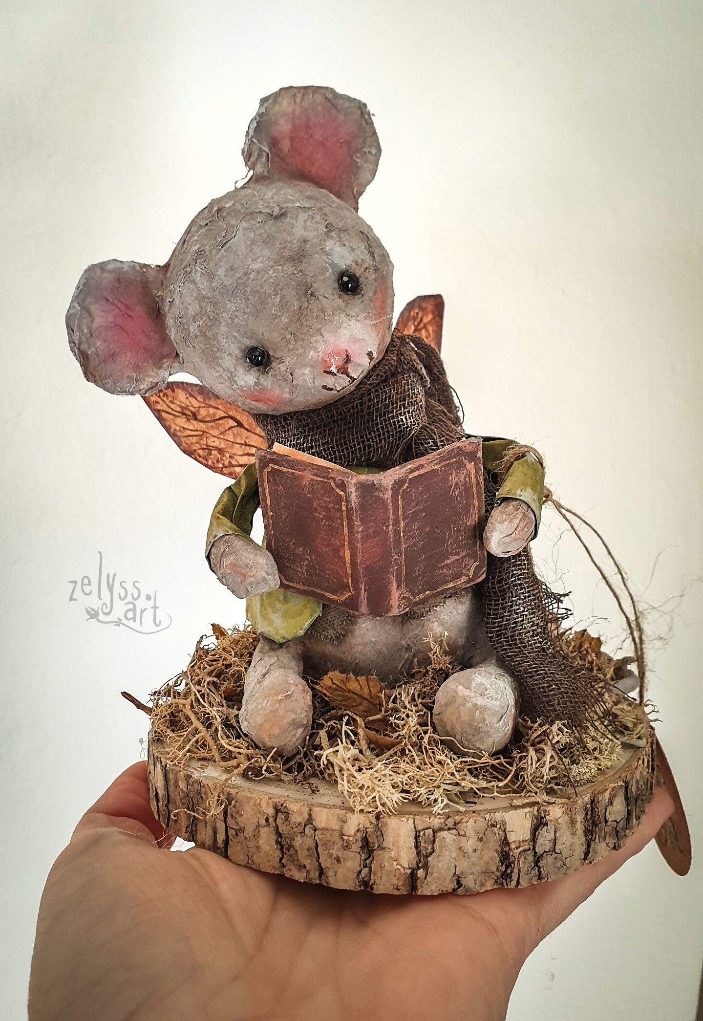 💚 Meet my handmade art sculptures made from paper and recyclable materials ♻️🍃🌏: Here is my little fairy-mouse, commonly known as Whistlewhisker! Oh, he’s no ordinary mouse – he has wings! And is too studious for his own good! He has found a very old spellbook tucked beneath a root in the library stump.